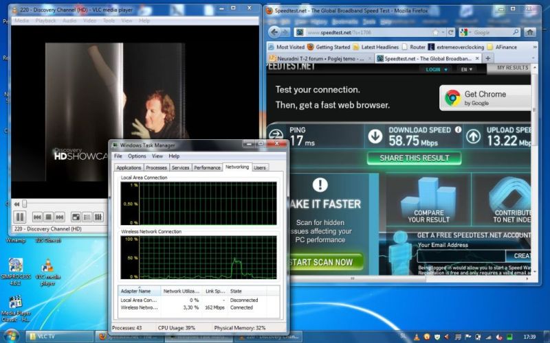 Slika iz prenosnika z VLC in Discovery HD + SpeedTest + TaskManager + na mašini na žici laufa VLC SLO HD. Kaj pa mulac na svoji mašini dol vleče pa ne vem