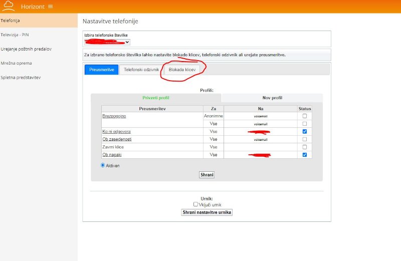 Blokada posameznih številk je možna le na aparatu.