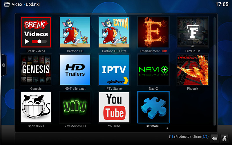 Na domači strani Kodija kliknemo na VIDEO in Dodatki. Spustimo se na dno in izberemo zadnjo ikono/možnost "Get more ...".