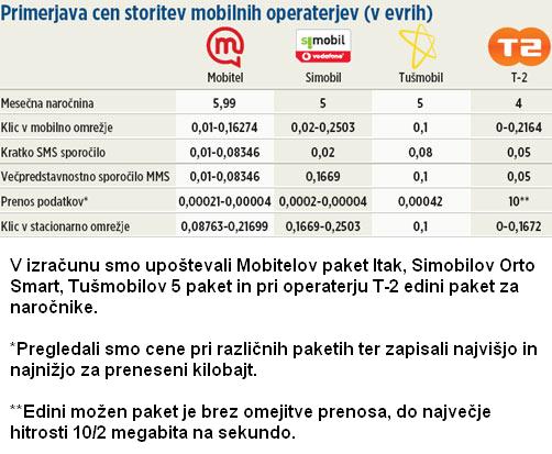 Pravtako je pri T-2 velika razlika v katero tuje omrežje kličeš, ker je drugje standard, da imajo enake cene v druga omrežja. Tako je najvišja ena 21,64 centov zavajanje, ker na tabeli sploh ni Tušmobila. Treba je potem primerjat le 3 operaterje med seboj. T-2 klic v Mobitel je 9,31 centa, v Simobil pa 11,39 centa, kar je oboje mnogo ceneje od klicev iz Mobitela in Simobila v druga omrežja (kjer je cena za klice v vsa druga mobilna omrežja enaka).
