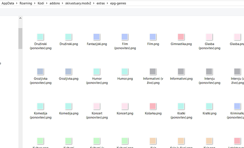 Jaz imam tukaj mapo na naslovu addons/skin.estura.modv2/extras/epg-genres V njej dajem imena barvnim fajlom. Posebnih znakov kot je "/" pa ne prime.