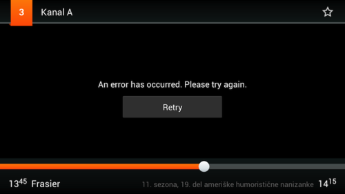 Probaj spremenit video quality v settings.Matib napisal/-a:Meni javlja to napako(v priponki) An error has occurred. Please try again. in opcija retry. Aplikacijo večkrat ponovno naložil, je updejtana na zadnjo verzijo in sprobano preko wifi in 3g(simobil).